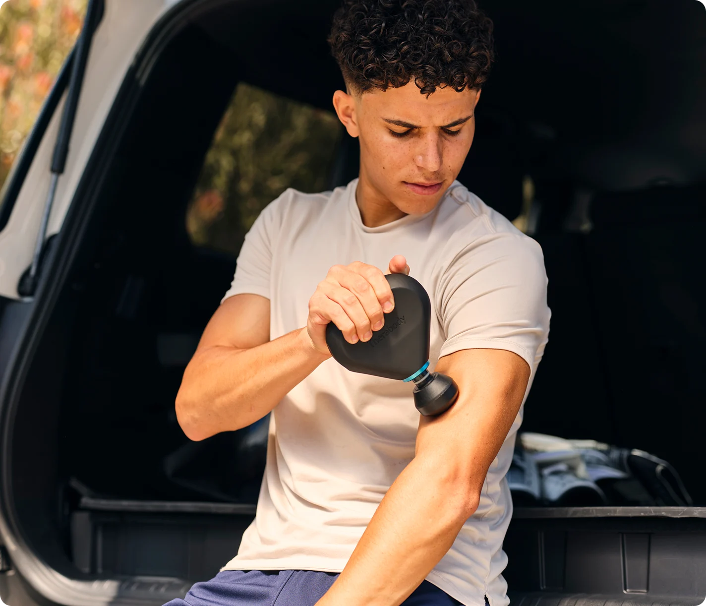 - Cílená perkusivní masáž doplněná tepelnou terapií pro hlubší a rychlejší regeneraci na cestách